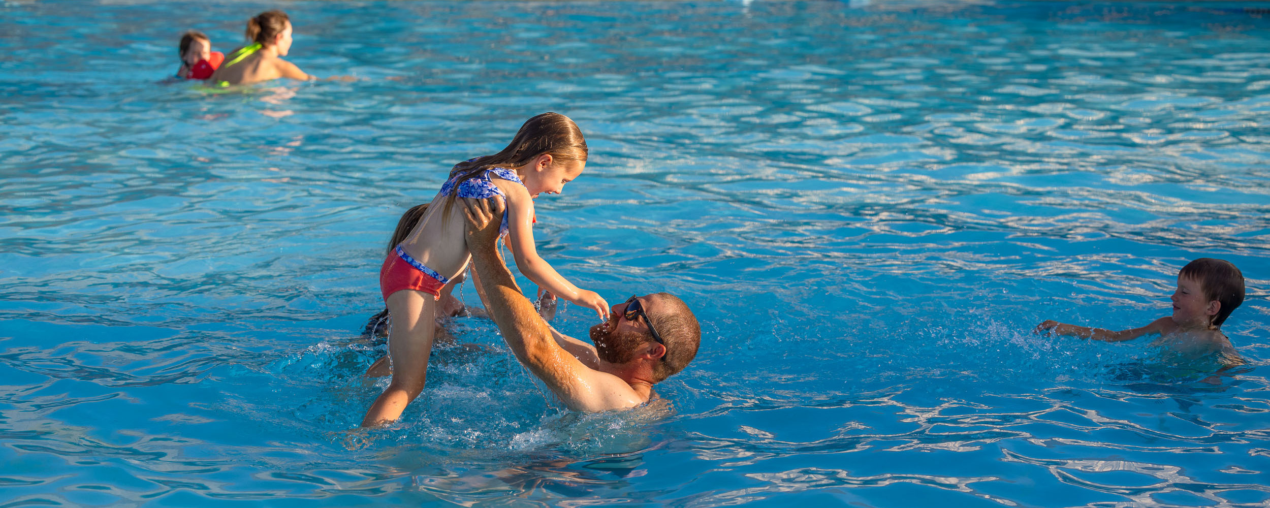The hot soaking pools are intended for soaking, not water play. Floats in the deep end of the large pools might give a sense of false security to a weak swimmer. Lap swimmers also use the deep ends.